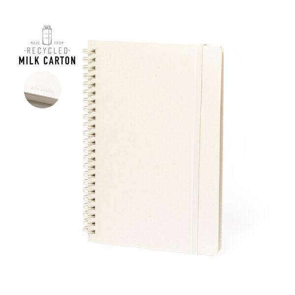 Livret à double anneaux métalliques A5 avec cpuvertures rigides fabriqués à partir de cartons de lait recyclés. Intérieur avec 80 feuilles de couleur naturelle à une bande et élastique de fermeture de couleur naturelle. Logo de Recycled Milk Carton sur la couverture et présenté dans un sac individuel recyclé. Les cartons de lait sont principalement constitués de carton et d’aluminium. Au cours de leur processus de recyclage, les différents matériaux de l’emballage sont séparés pour réutilisation et nouvelle utilisation, contribuant ainsi à parcourir le chemin infini de l’économie circulaire. Ce matériau se caractérise par son haut degré de recyclabilité, ainsi que par sa légèreté et sa résistance. Couverture Rigide. 80 Feuilles Cartons de Lait Recyclés